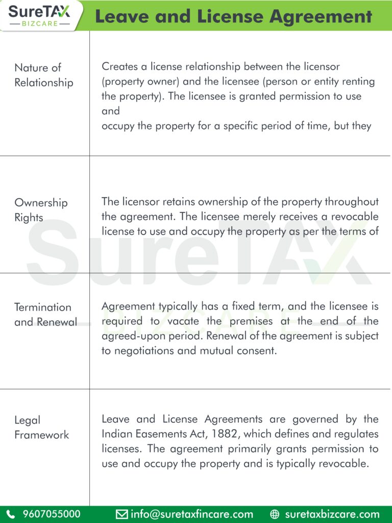 Leave and License Agreements typically involve reduced initial expenditures compared to conventional leases. The licensee remits a license fee or rent for temporary property utilization, often proving more economical, particularly for short-term arrangements.